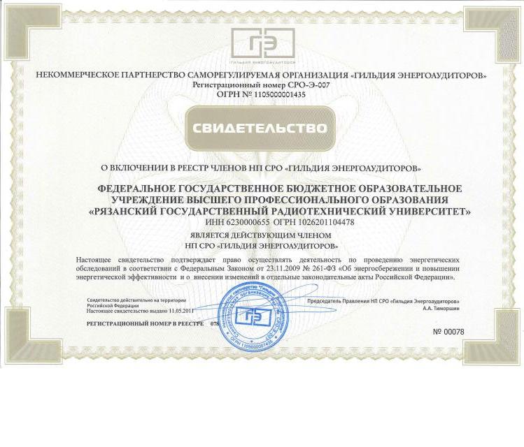 РГРТУ является, в соответствии с требованиями Федерального закона от 23.11.2009 № 261-ФЗ «Об энергосбережении и о повышении энергетической эффективности и о внесении изменений в отдельные законодательные акты Российской Федерации», зарегистрированным членом Некоммерческого партнерства - Саморегулируемая Организация "Гильдия Энергоаудиторов" (Свидетельство о членстве в СРО № выдано 11.05.2011.) и имеет допуск к проведению энергетических обследований.
